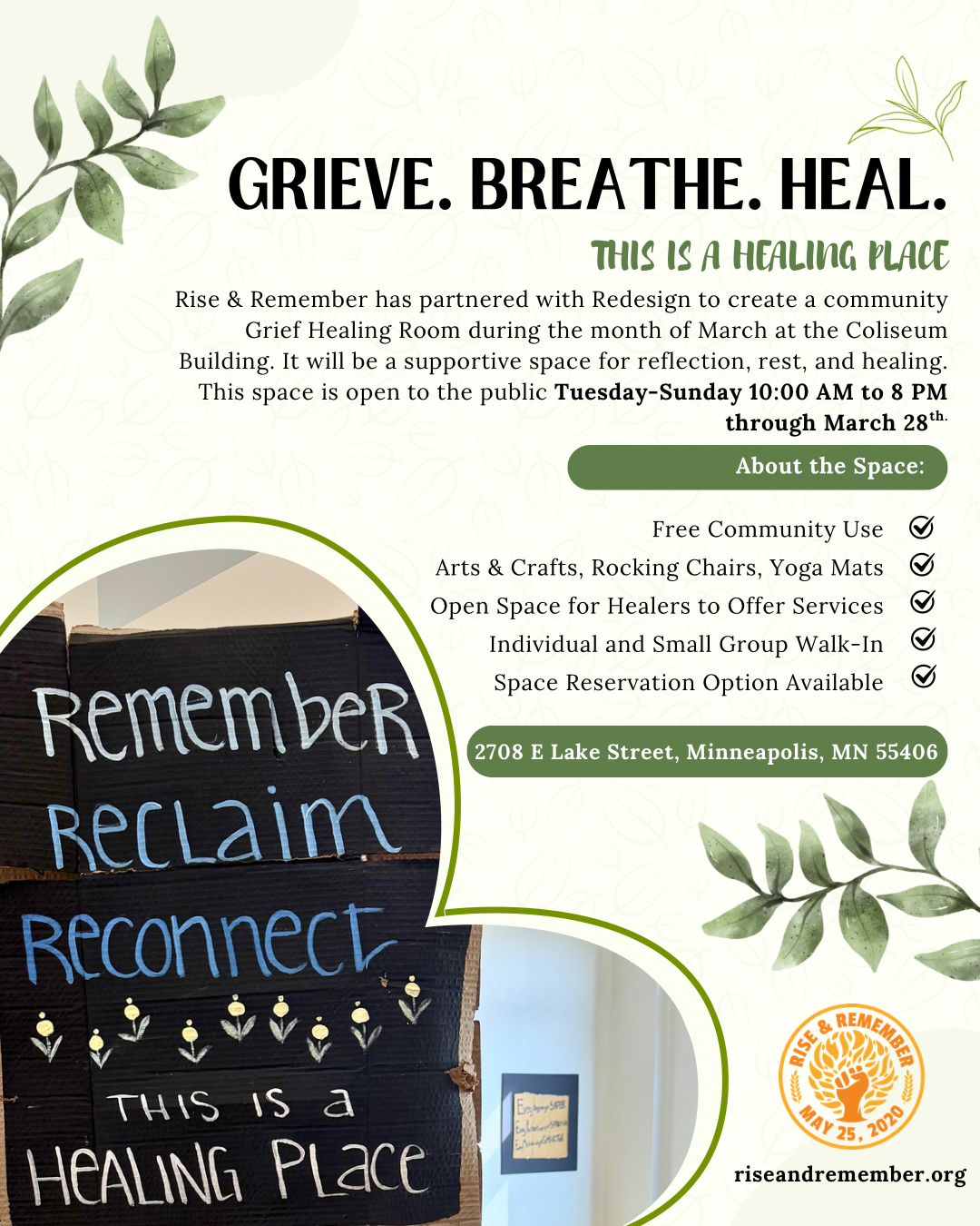 Rise & Remember has partnered with Redesign to create a community Grief Healing Room during the month of March at the Coliseum Building. It will be a supportive space for reflection, rest, and healing.